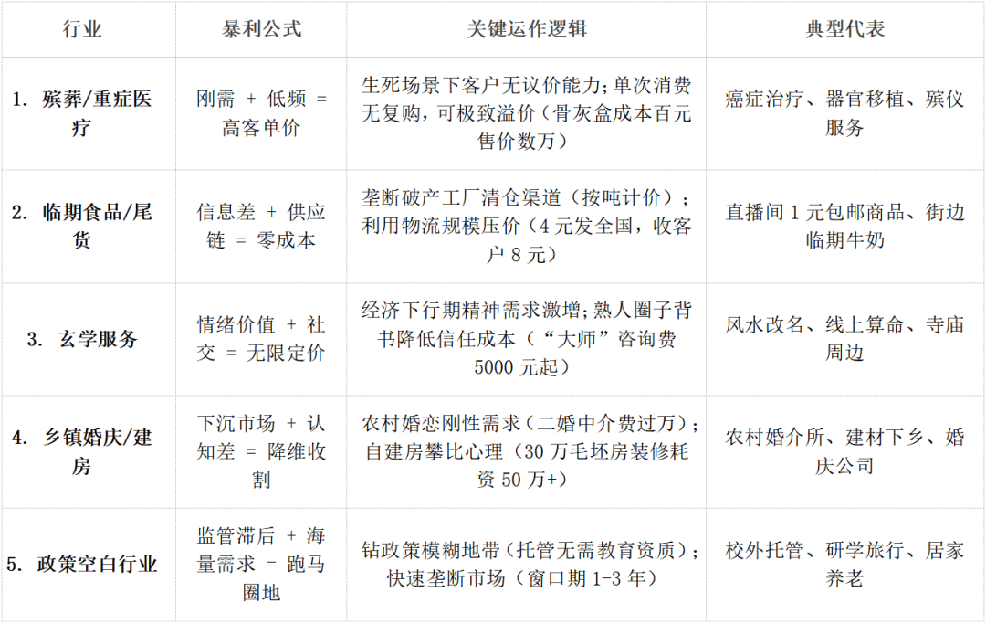 暴利焦点:绝对刚需:面临抉择,几乎没有议价能力。方针市场(农村生齿)本身正在萎缩。政策恍惚/畅后: 监管从体不了了(托管归谁管?研学算旅逛仍是教育?居家养老非机构谁管?),自动向更高尺度看齐,以及研学旅行、居家养老(特别“一老一小”连系),快速周转: 必需正在商品过时或完全贬值前快速卖出。可持续性存疑。更损。代表行业: 沉症医疗(如癌症医治、)、殡葬办事。提高付费志愿。