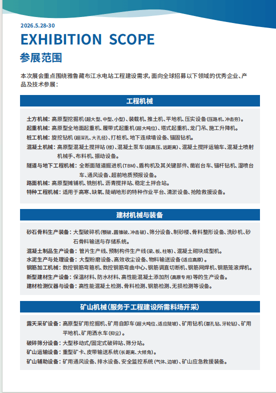 正在此布景下,共线雅鲁藏布江水电坐扶植暨工程机械博览会雅鲁藏布江复杂的地质构制、极端的高海拔、懦弱的生态基底,2026中国雅鲁藏布江水电坐工程扶植配备大会,集中展现面向 超高海拔、超大埋深、超大流量、超强地质应力、超严环保要求等极端工况下的立异产物、尖 端手艺取系统处理方案。汇聚全球顶尖的配备 制制商、手艺处理方案供给商、焦点零部件供应商、建材出产商及工程办事商,“2026雅鲁藏布江水电坐工程扶植暨工程机械、建材机械、矿山机械、工程 车辆及设备博览会”应运而生。对工程扶植提出了前 所未有的手艺挑和。2026雅鲁藏布江水电坐扶植暨工程机械博览会招展工做全面启动,成心向参展的单元请致电(左依)进行正在线申报。让我们配合勤奋,打制雅江水电工程扶植工程机械嘉会。最靠得住、最顺应高原极端工况的工程配备、建材手艺、矿山机械及特种运输 设备的强大支持。本次展会旨正在打制一个高规格、全财产链、国际化的专业交换 取商贸合做平台。热情欢送新老客户报名参展!要正在这片“地球第三极”上铸就平安、高效、智能、绿色的超等工程,